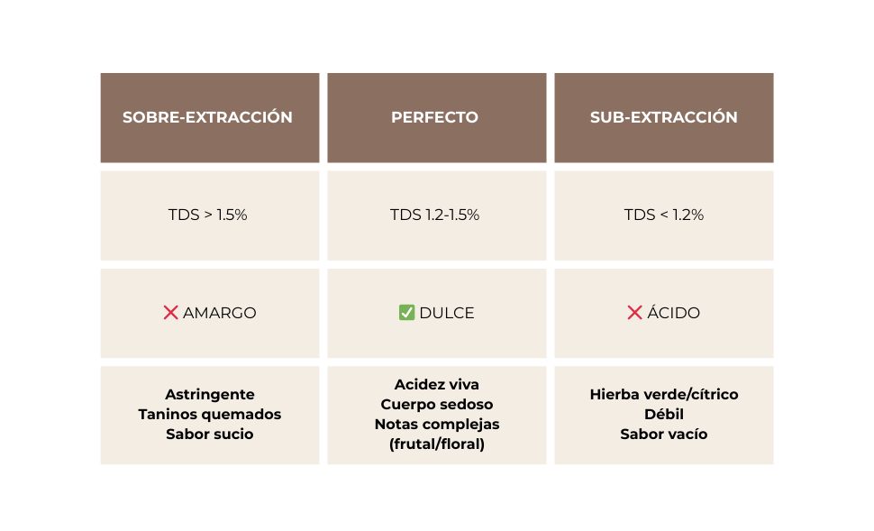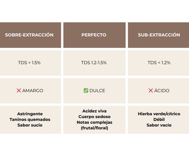 ¿Por qué pasa? Muy rápido = café ácido sin sabor. Muy lento = amargo.