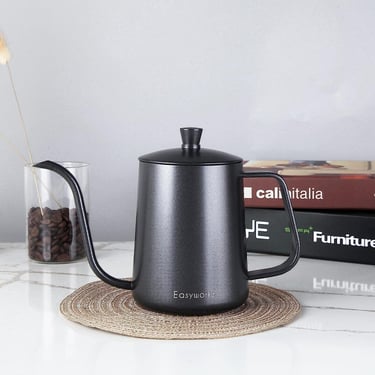 Jarrita delgada con pico fino. Vierte agua lentamente controlada en círculos perfectos sin salpicar.