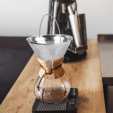 Filtro metálico reutilizable para V60. Lava con agua, dura años. No da sabor a papel.