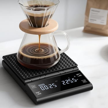 Balanza pequeña con temporizador. Pesa café (15g exactos) + cronometra 2:45 tu infusión.